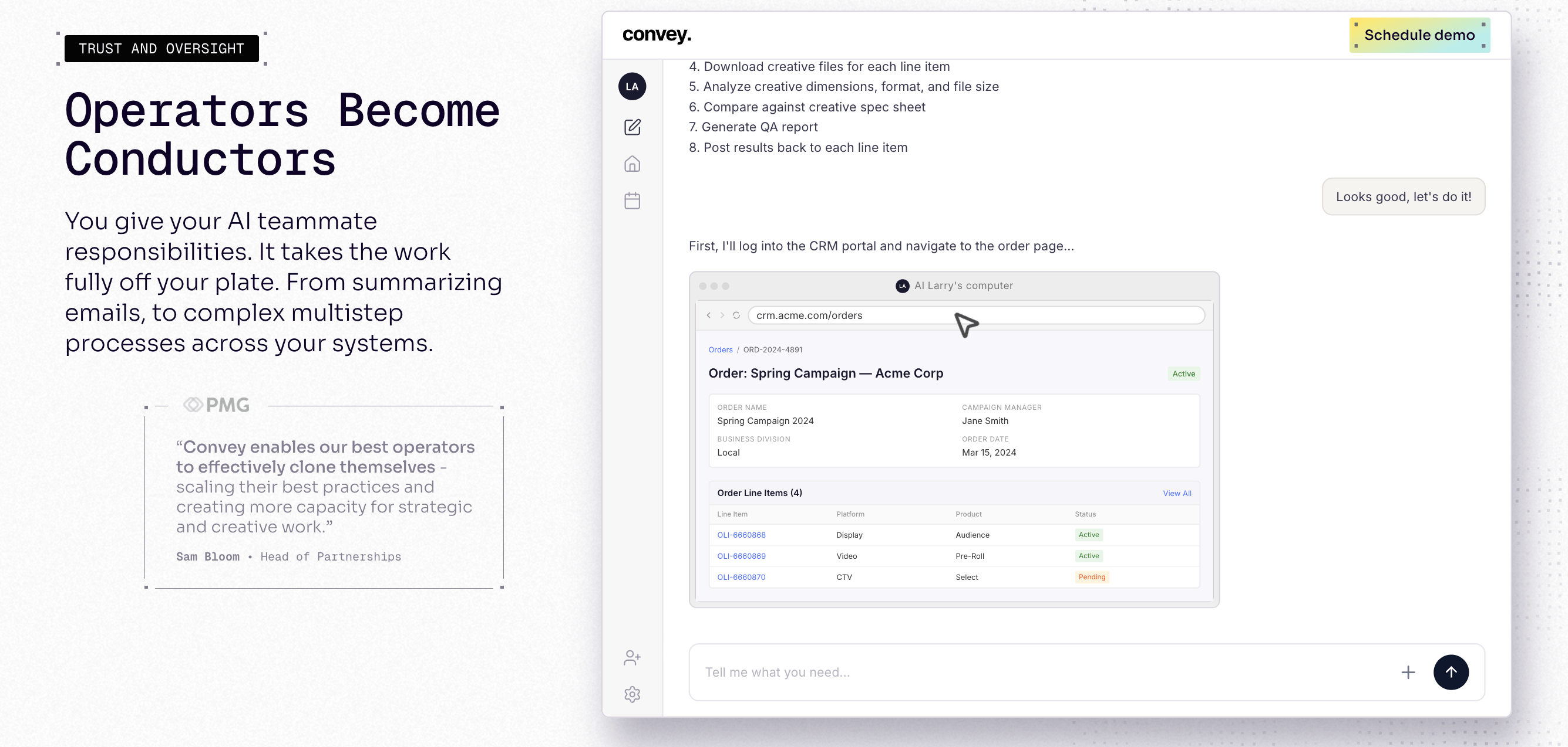 Convey works differently. It learns how your team actually gets work done, turns that into a repeatable process, and runs it the same way every time. Non-technical users set up their first workflow in about three hours.